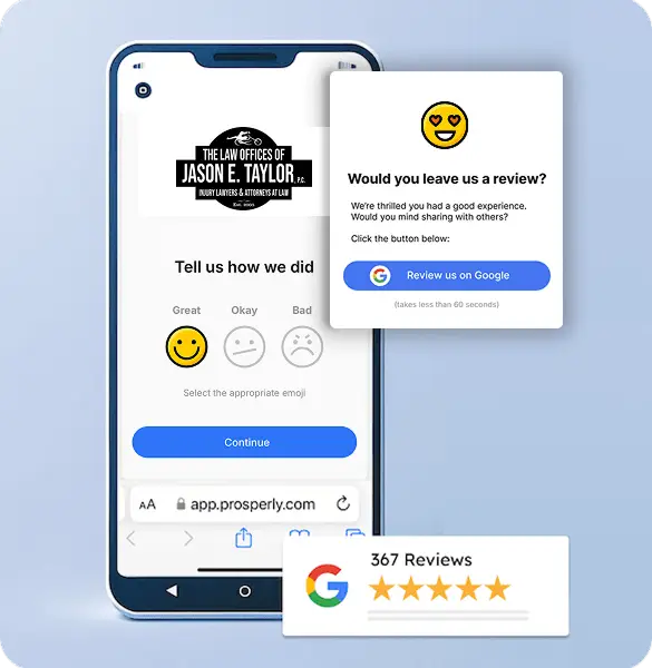 Prosperly makes it ridiculously easy to get your happy clients to leave a positive review for your law firm with our review outreach platform and automatic follow ups.